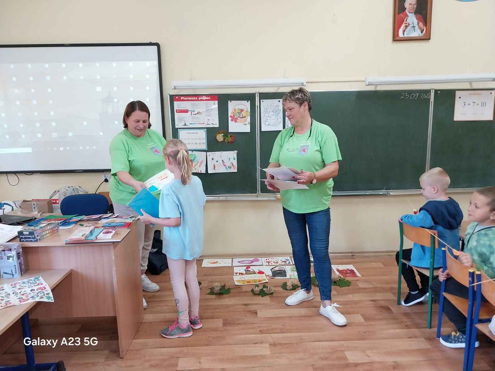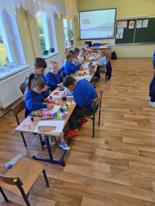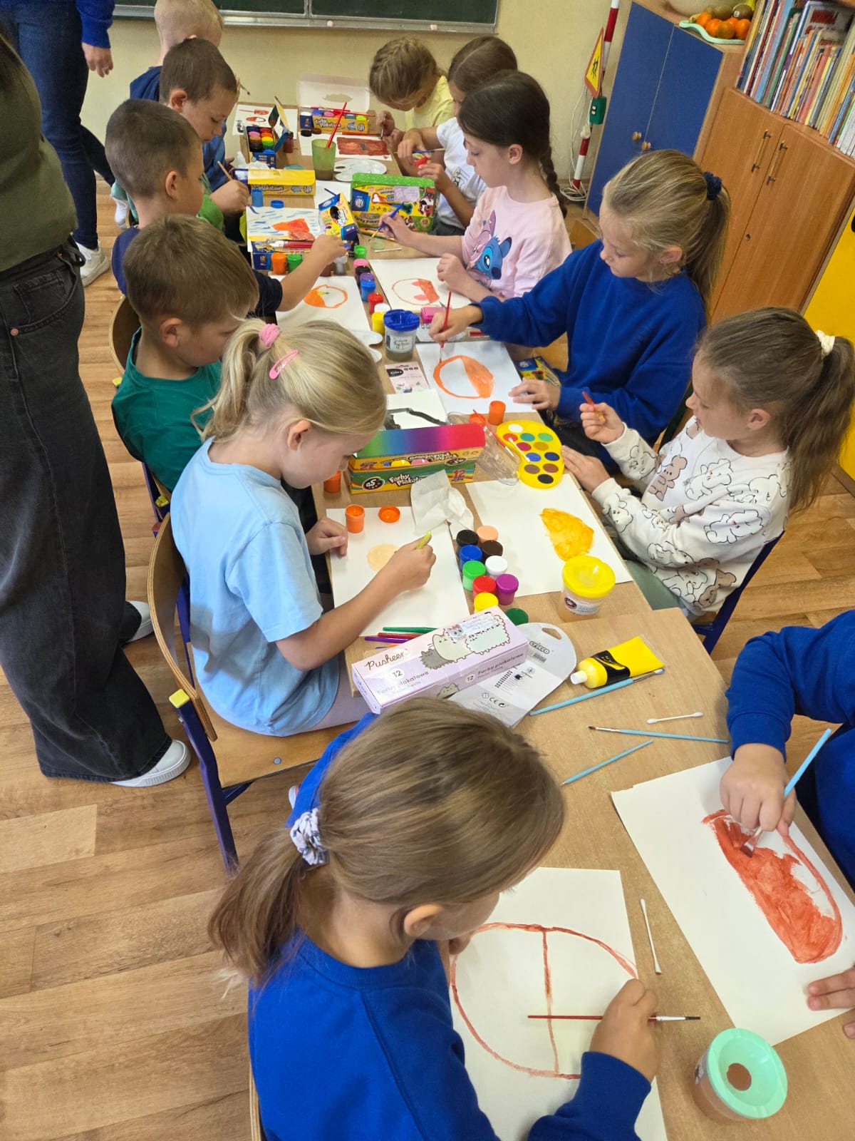 I tak 23 września uczniowie klas 1-3 wraz z wychowawczyniami wzięli udział w trzygodzinnych warsztatach plastycznych o tematyce jesiennej pn. ,,Dary jesieni", które poprowadziły członkinie stowarzyszenia: Pani Elżbieta Kazaniecka, Pani Monika Mateńka, Pani Mirosława Kazaniecka i Pani Izabela Kubajek. Zajęcia plastyczne miały na celu zapoznanie dzieci ze znaną, ale mało docenianą formą plastyczną jaką jest metoda stemplowania oraz zachęcenie uczestników do wykonania prac plastycznych - kosza z darami jesieni z wykorzystaniem stempli z ziemniaków. Dodatkowo dzieci wykonały jeżyki z ziemniaków wykazując się dużą kreatywnością i pomysłowością. Zwieńczeniem warsztatów plastycznych było przygotowanie pysznych szaszłyków owocowych oraz rozstrzygnięcie konkursu plastycznego ,,Dary jesieni”.