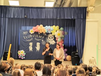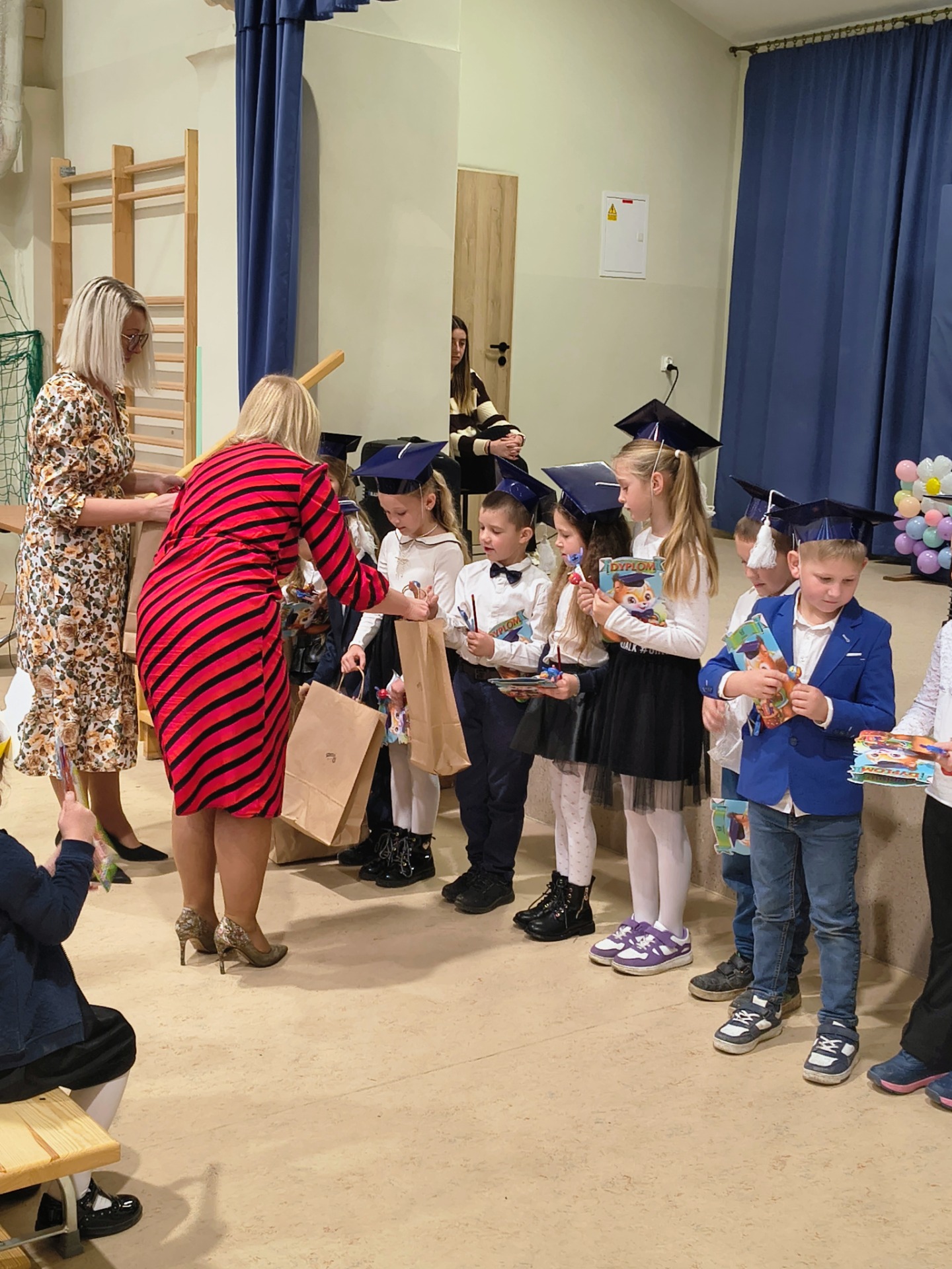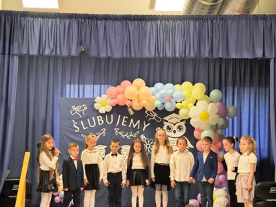 Wydarzenie rozpoczęło się od części artystycznej, podczas której maluszki zaprezentowały swoje umiejętności, dając tym samym dowód na to, jak wiele już potrafią. Były więc piosenki, wierszyki, zabawy ruchowe i taniec. Po części artystycznej dzieci obiecały: zgodnie bawić się w przedszkolu, przychodzić każdego dnia z uśmiechem, słuchać pani i pomagać kolegom, być dzielnymi przedszkolakami. W dalszej części Pani dyrektor dokonała uroczystego pasowania każdego dziecka na przedszkolaka. Na pamiątkę tego ważnego wydarzenia wszyscy otrzymali dyplom pasowania oraz upominki przygotowane przez rodziców. W dalszej części uroczystości pełnoprawnymi członkami społeczności szkolnej stali się pierwszoklasiści. Z tej okazji uczniowie przedstawili także swój program artystyczny. Dzieci z wielkim zaangażowaniem recytowały wiersze, śpiewały piosenki oraz prezentowały swoją wiedzę. Po akademii uczniowie klasy I złożyli uroczyste ślubowanie. Następnie Pani dyrektor dokonała uroczystego pasowania pierwszoklasistów. Na zakończenie uroczystości dzieci otrzymały dyplomy, prezentami od rodziców oraz starszych uczniów szkoły oraz otrzymali legitymacje uczniowskie.