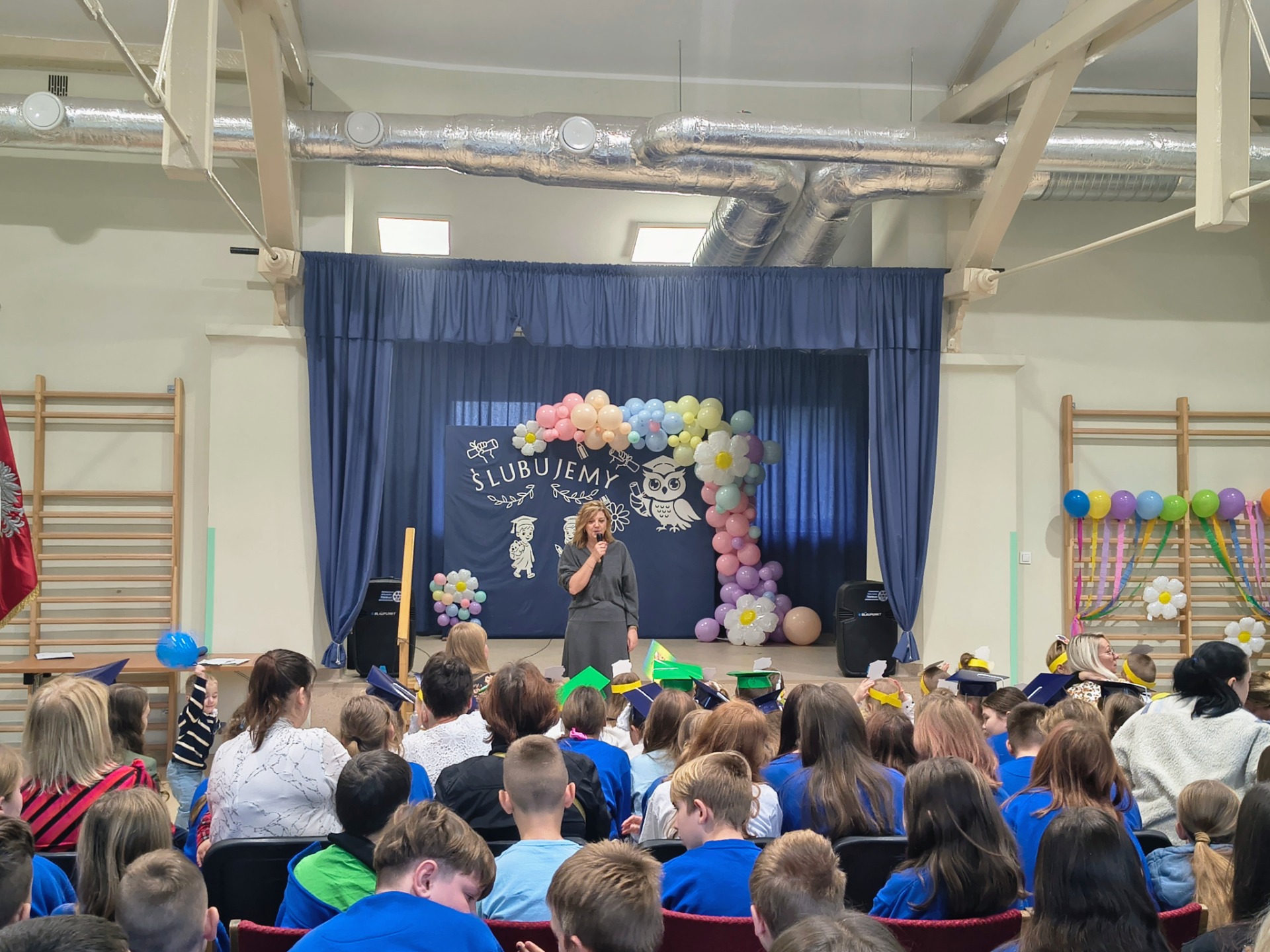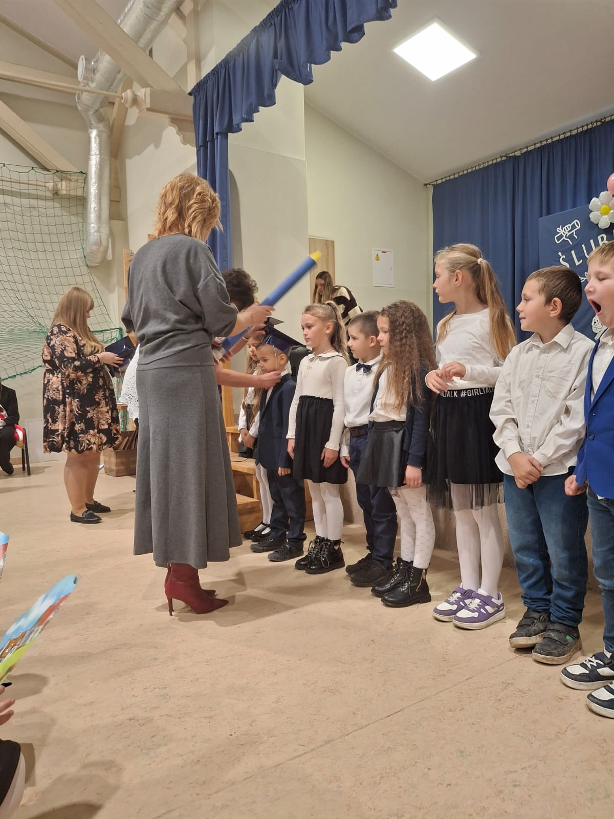 Dzień 23 października 2025 r. pozostanie na długo w pamięci dzieci z naszego przedszkola oraz klasy I. Tego właśnie dnia odbyła się pierwsza ważna przedszkolna i szkolna uroczystość – pasowanie na przedszkolaka oraz pasowanie na ucznia. W tym ważnym dniu towarzyszyła nam Pani dyrektor Edyta Gudowska, Pani Justyna Chudek kierownik referatu oświaty, rodzice, nauczyciele, pracownicy szkoły oraz starsi uczniowie.
