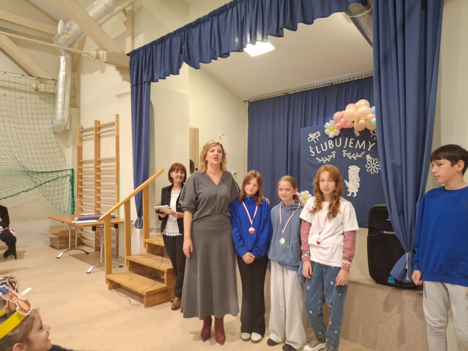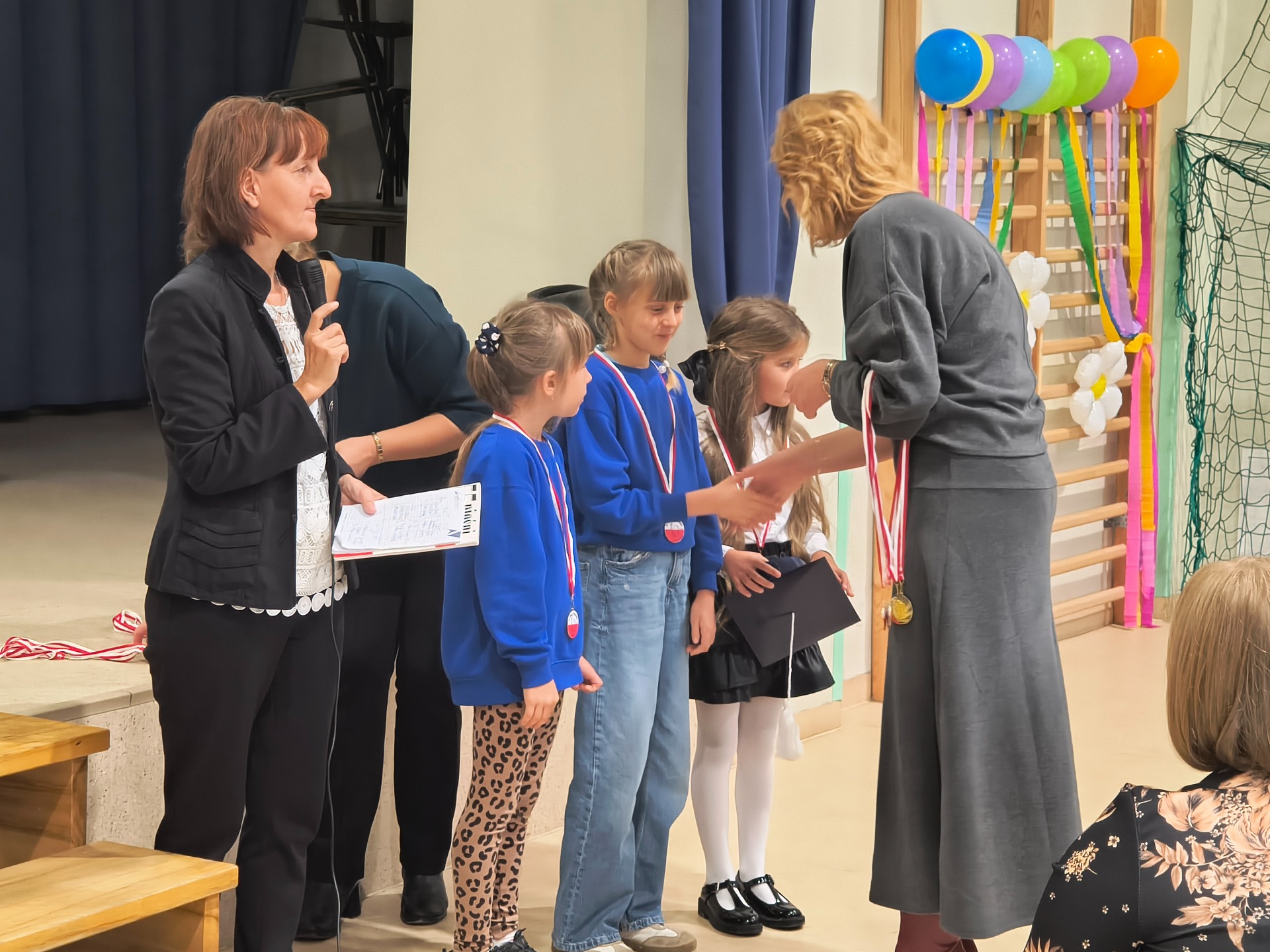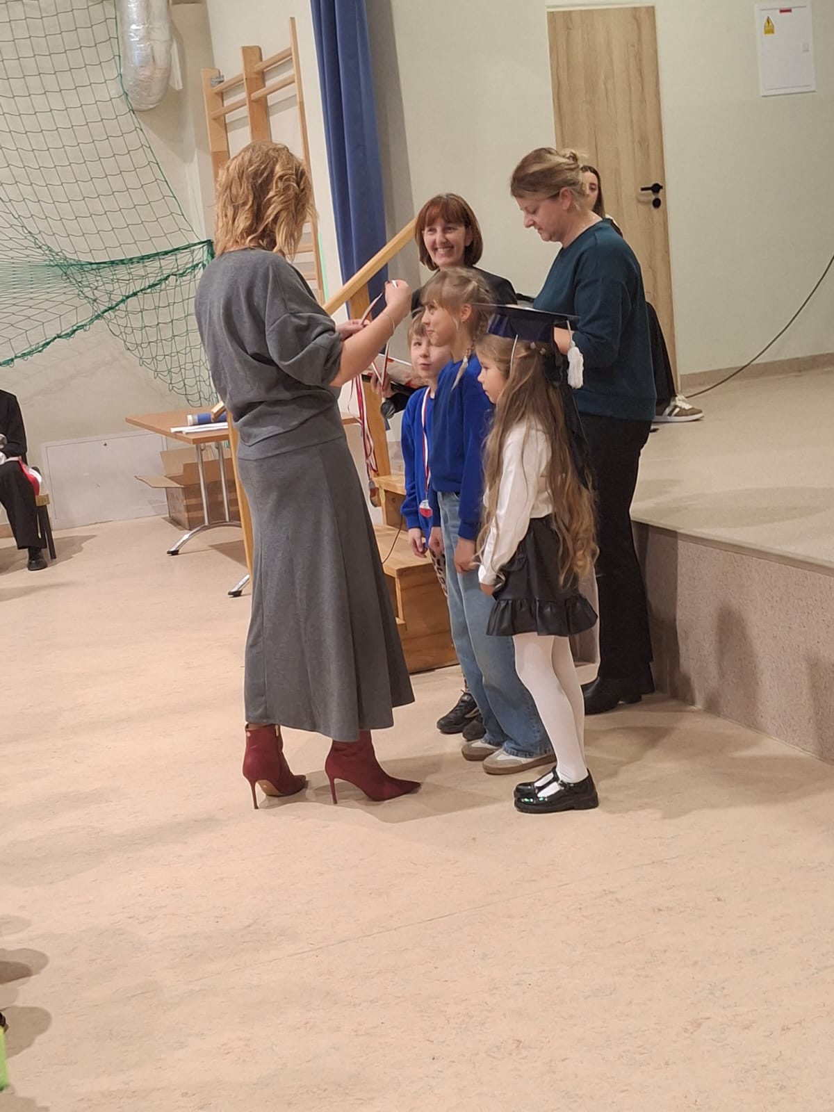 Po zakończeniu uroczystego pasowania Pani Dyrektor wraz z nauczycielami wręczyła medale za osiągnięcia sportowe w III szkolnym Biegu Papieskim.