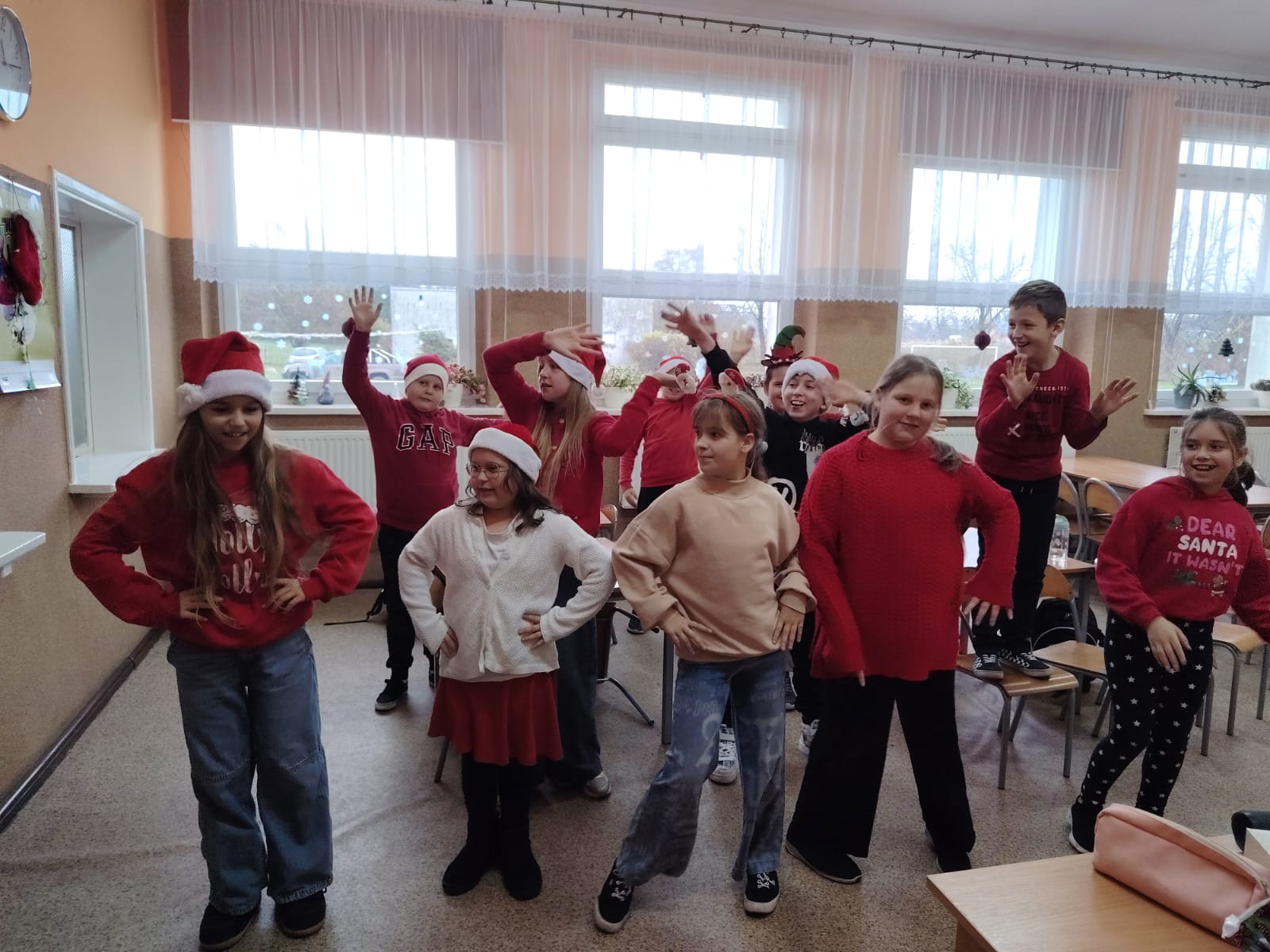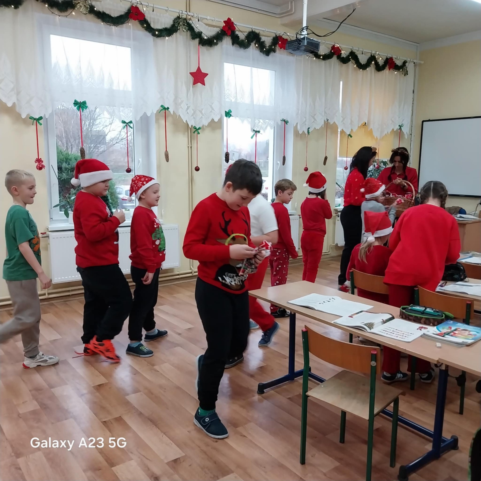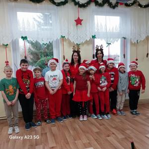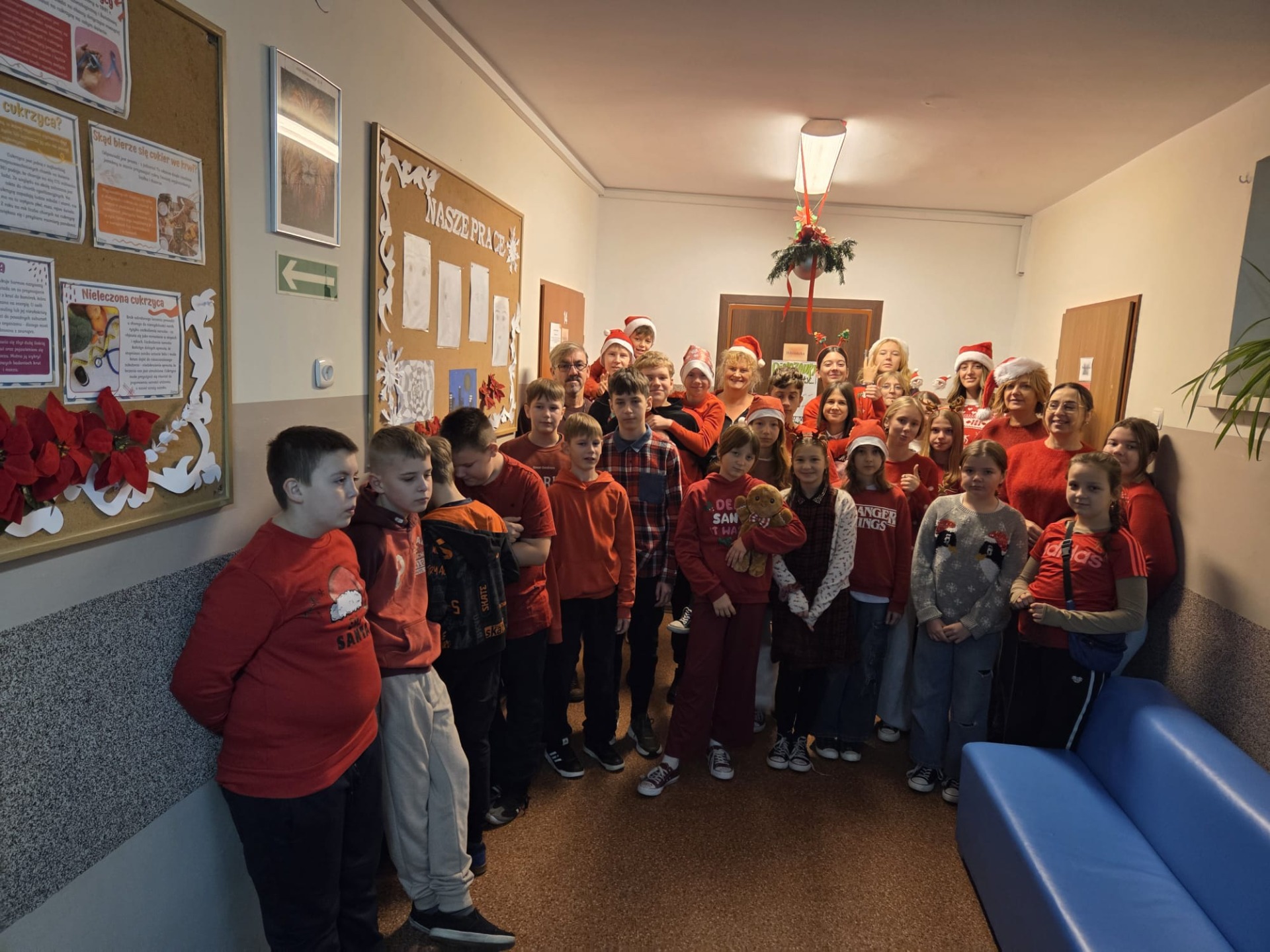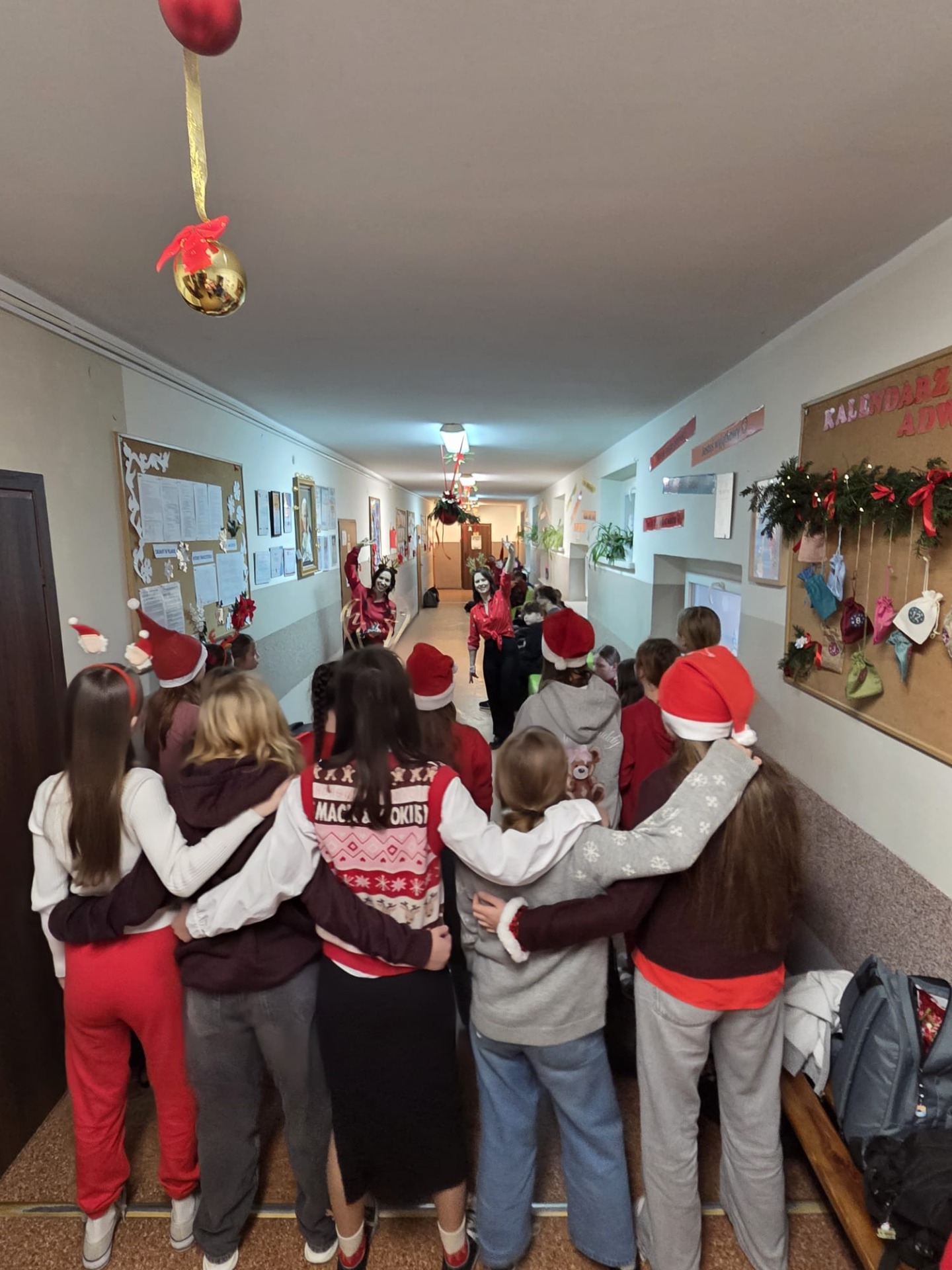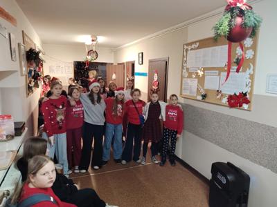 Podczas przerw uczniowie wspólnie kolędowali na szkolnych korytarzach. Wszyscy byli ubrani na czerwono, mieli mikołajkowe czapki oraz świąteczne akcesoria, co nadało całej uroczystości wyjątkowo radosny i magiczny, świąteczny klimat.