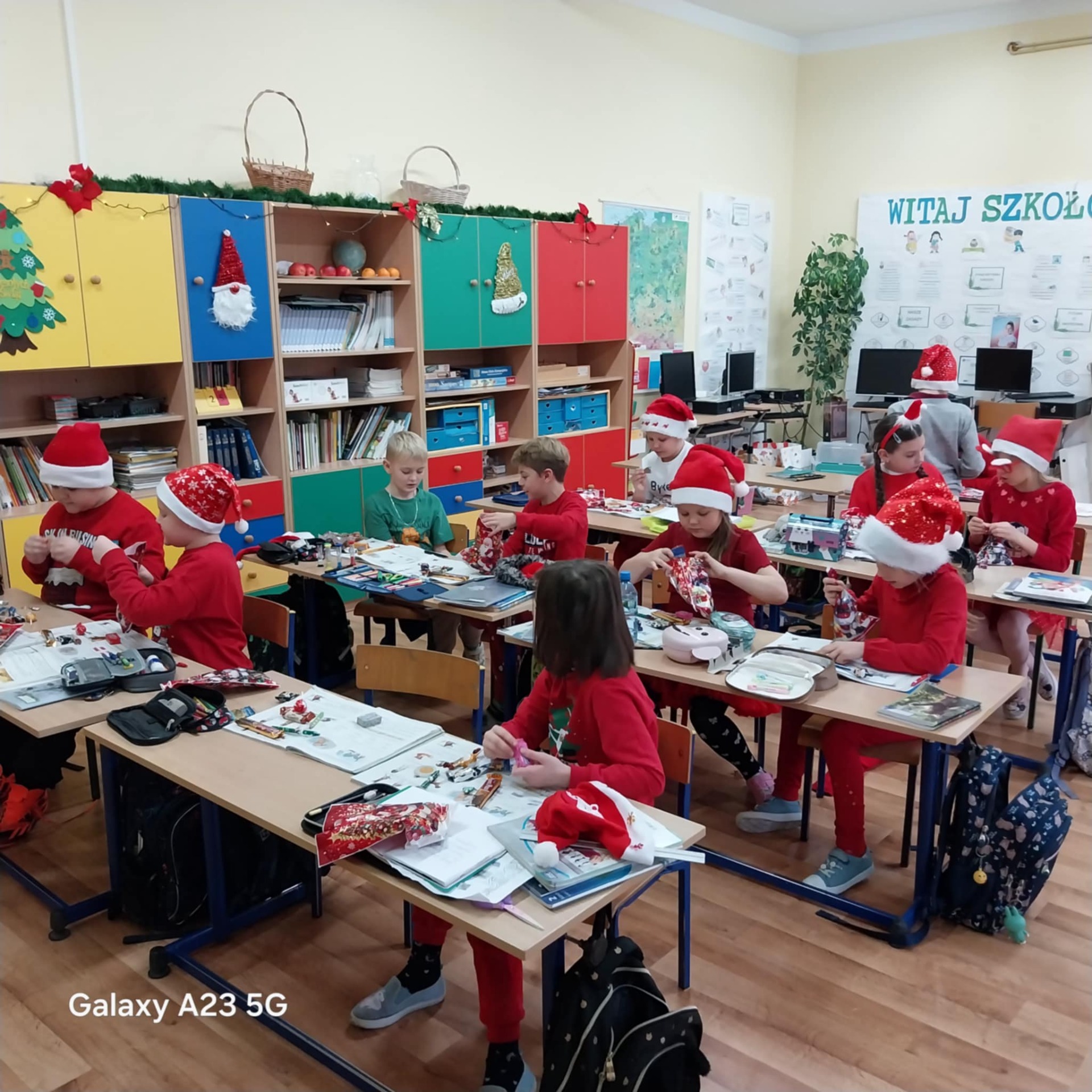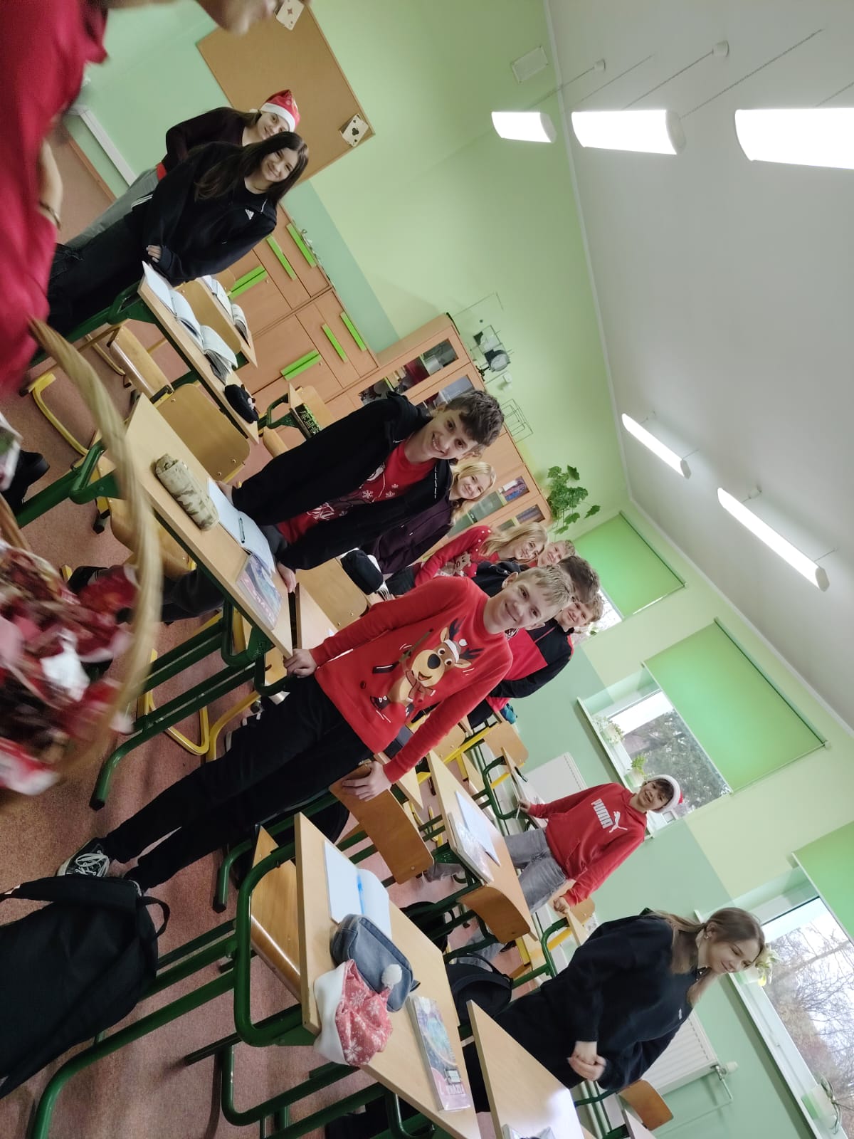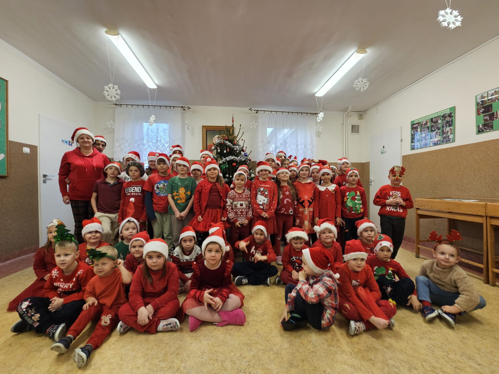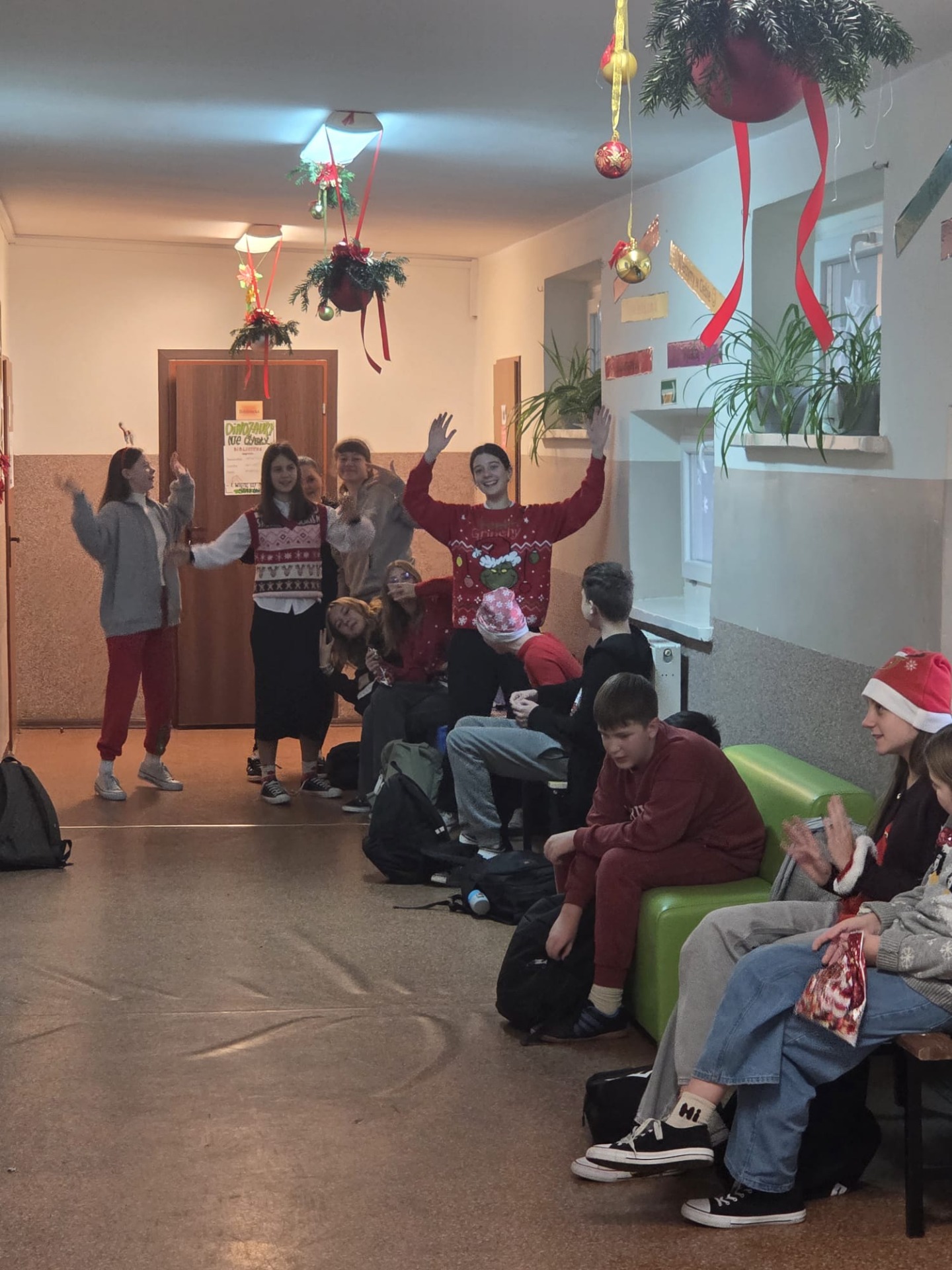 Podczas przerw uczniowie wspólnie kolędowali na szkolnych korytarzach. Wszyscy byli ubrani na czerwono, mieli mikołajkowe czapki oraz świąteczne akcesoria, co nadało całej uroczystości wyjątkowo radosny i magiczny, świąteczny klimat.