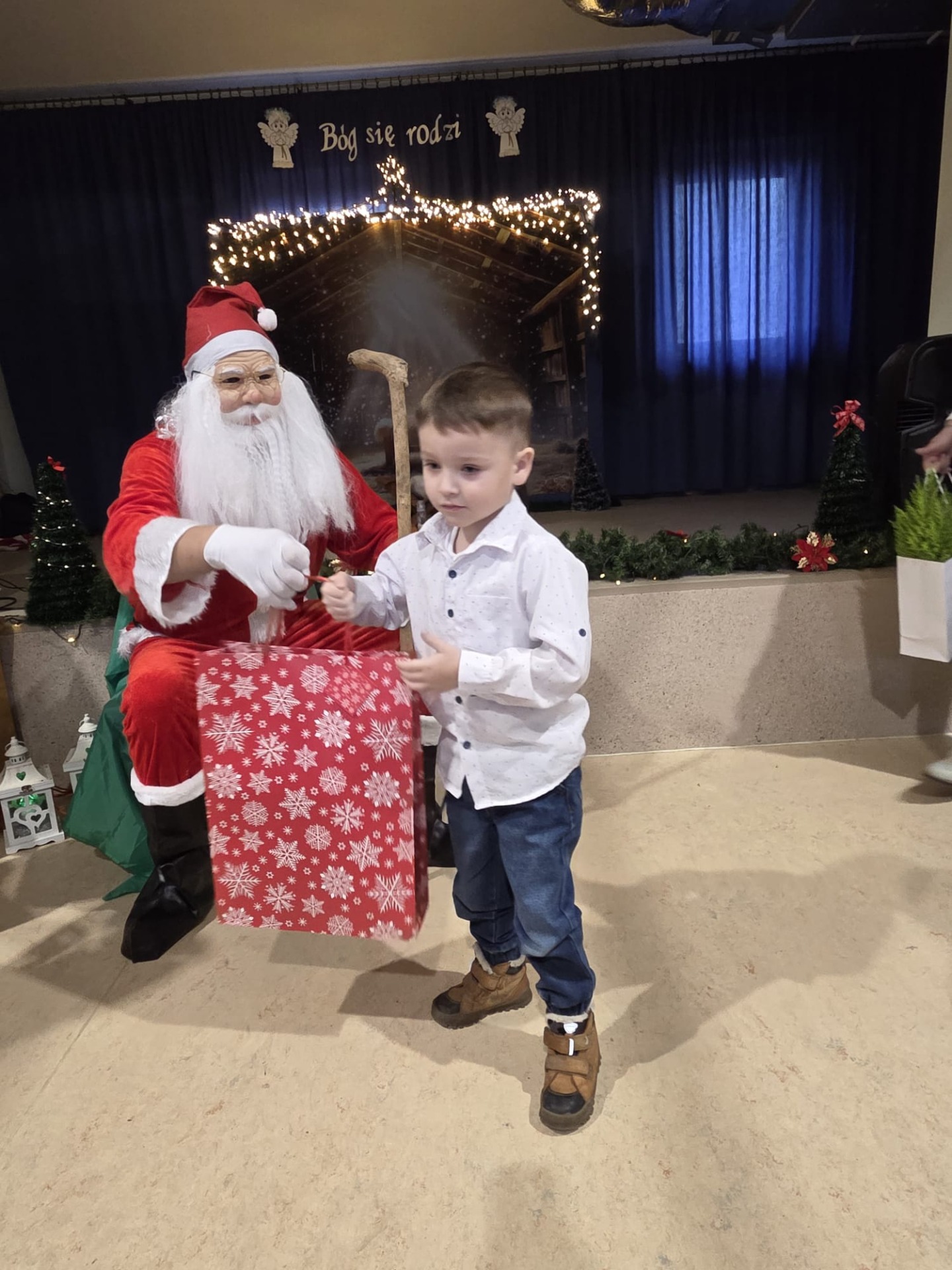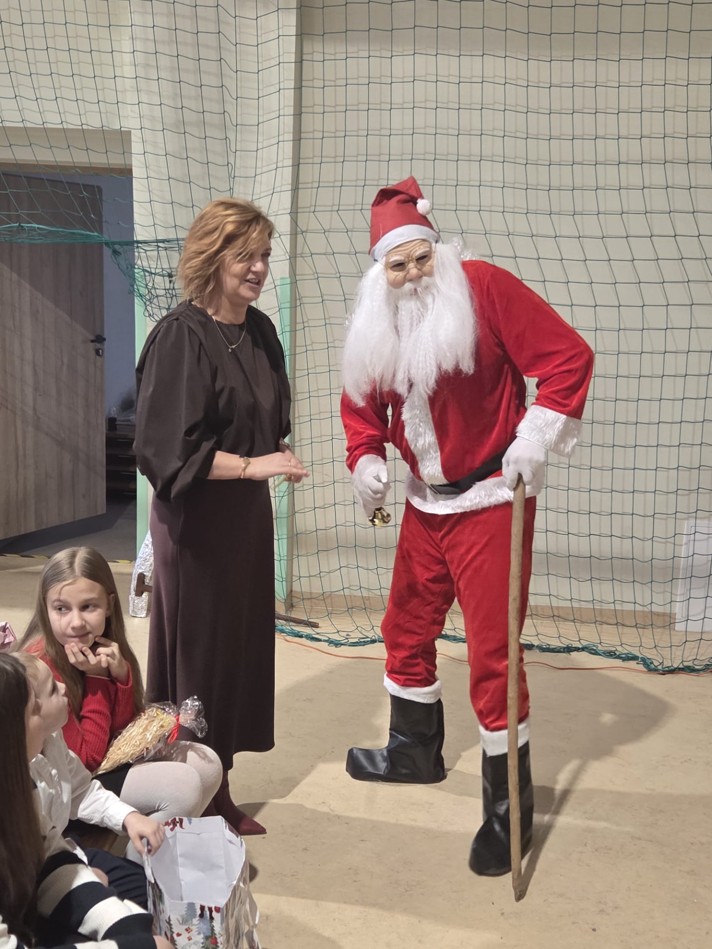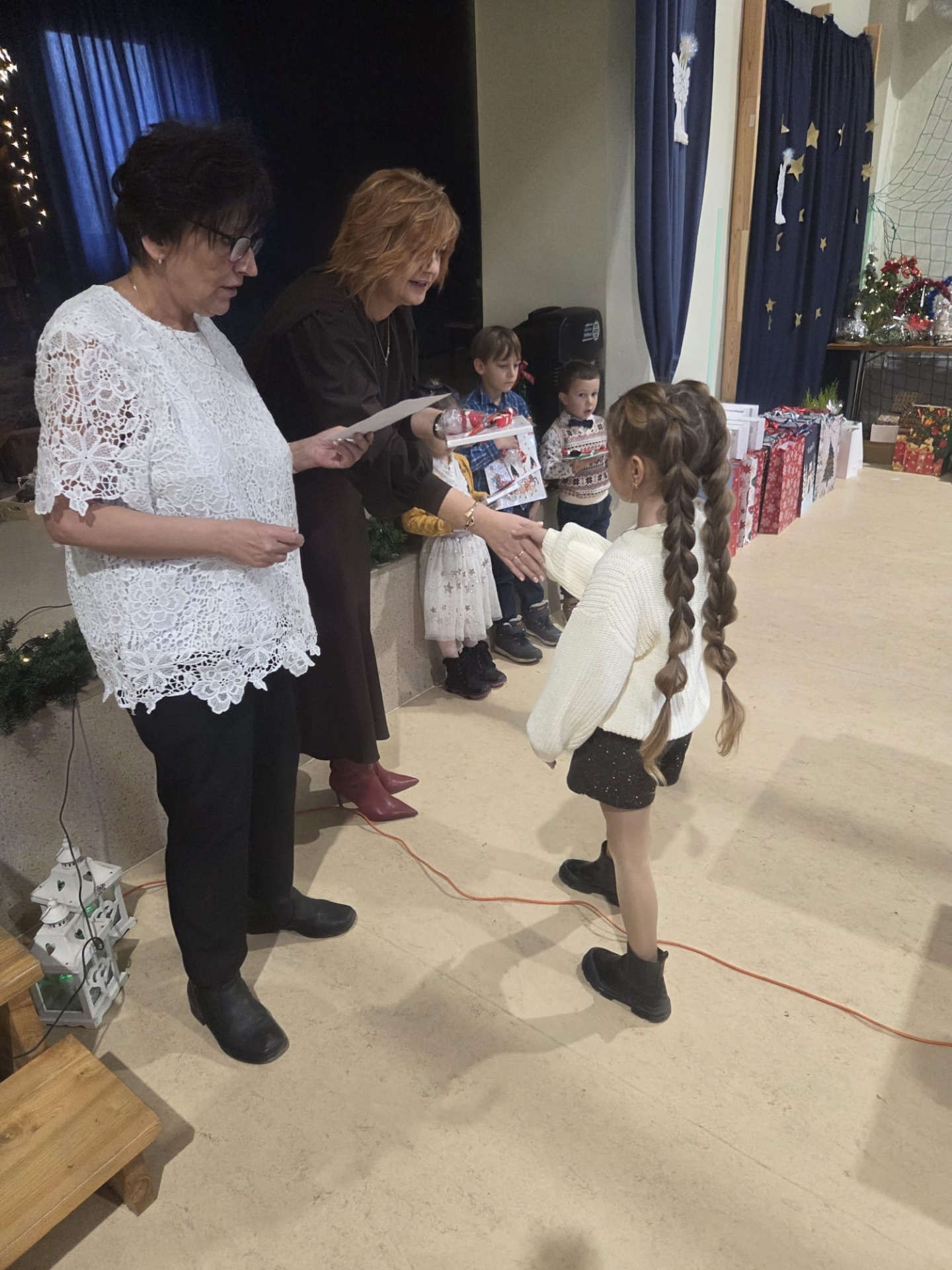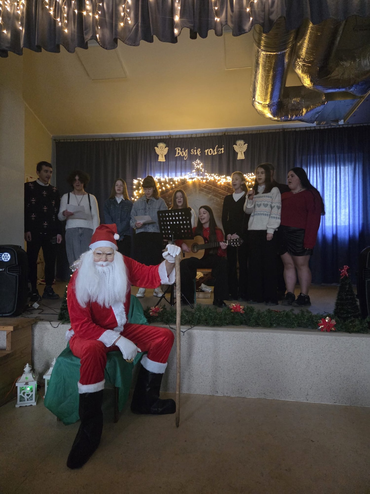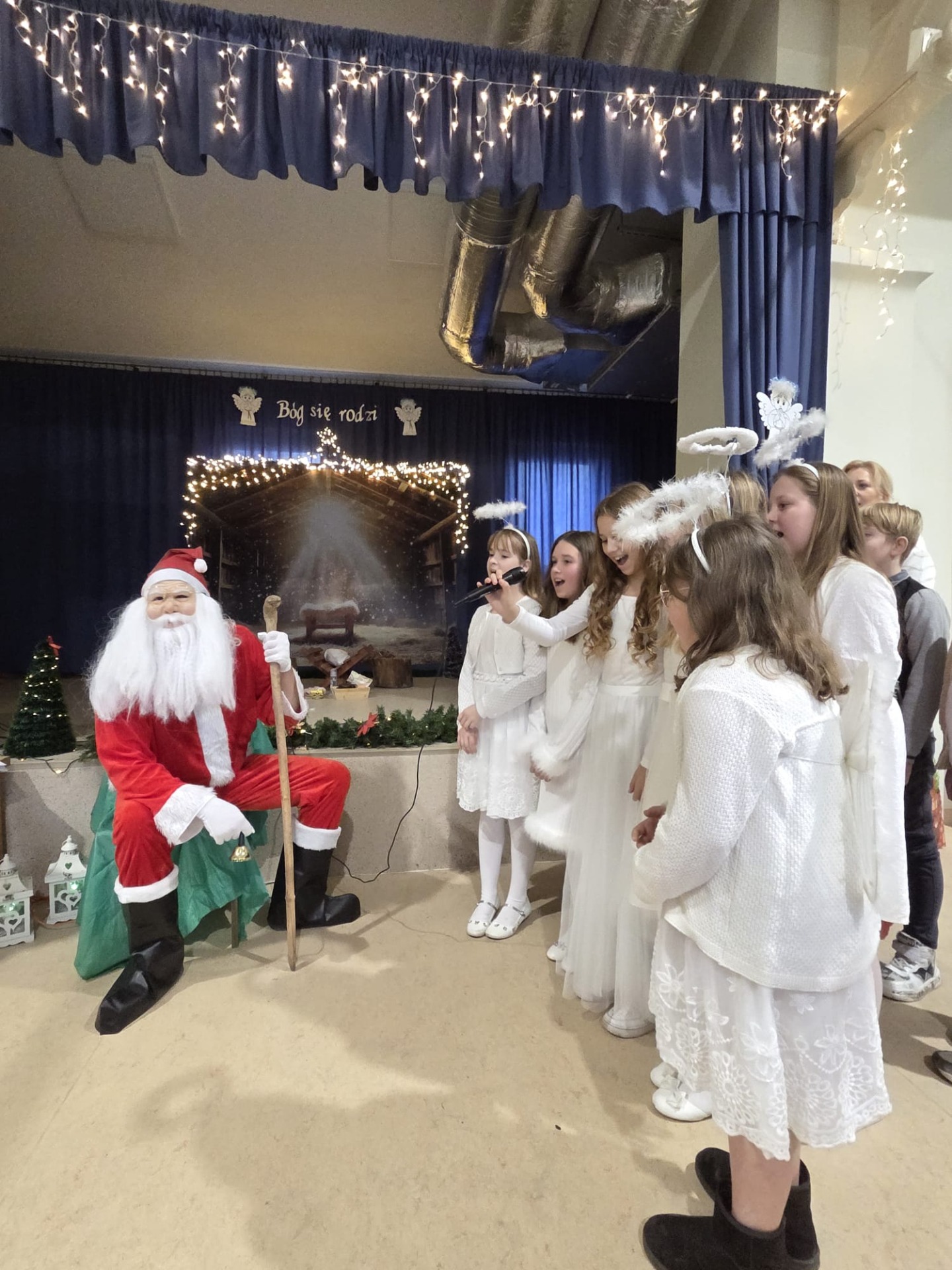 Również przedstawicielka gminy, Pani Justyna Chudek – kierownik referatu oświaty – skierowała do zgromadzonych ciepłe życzenia. Oczywiście nie zabrakło także wizyty Świętego Mikołaja, który wręczył prezenty wszystkim uczniom za pięknie zaśpiewaną kolędę.