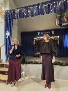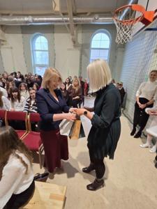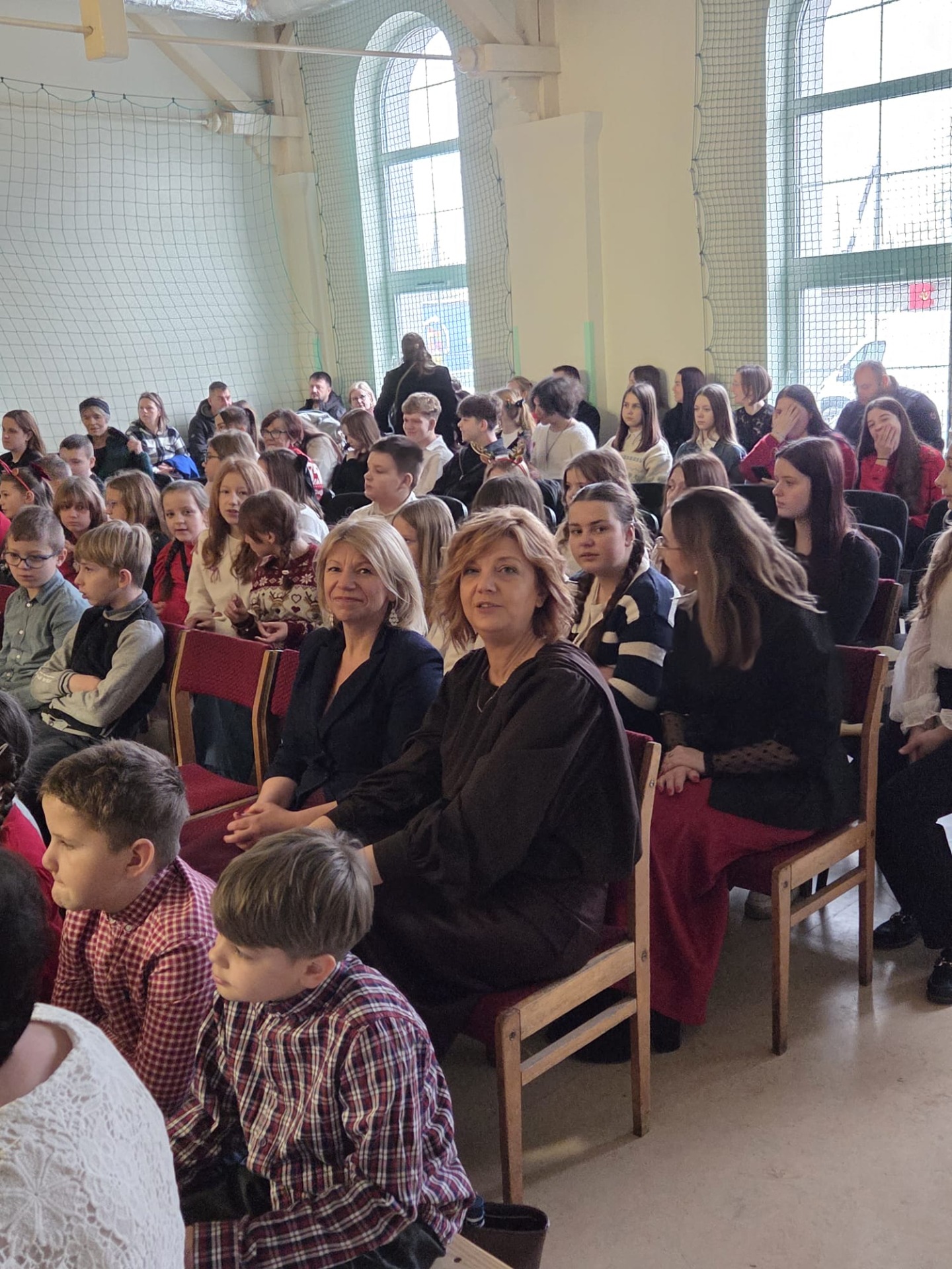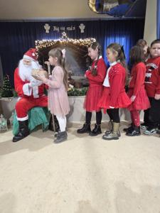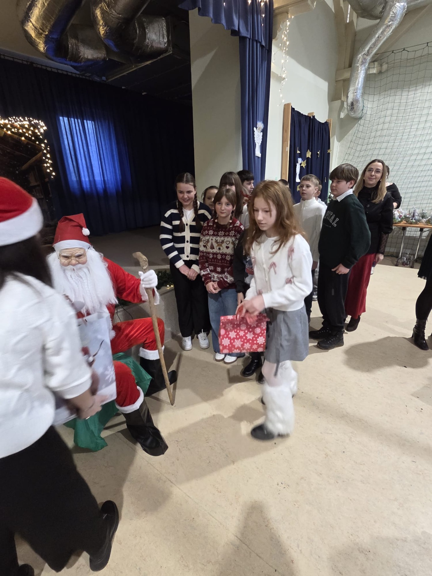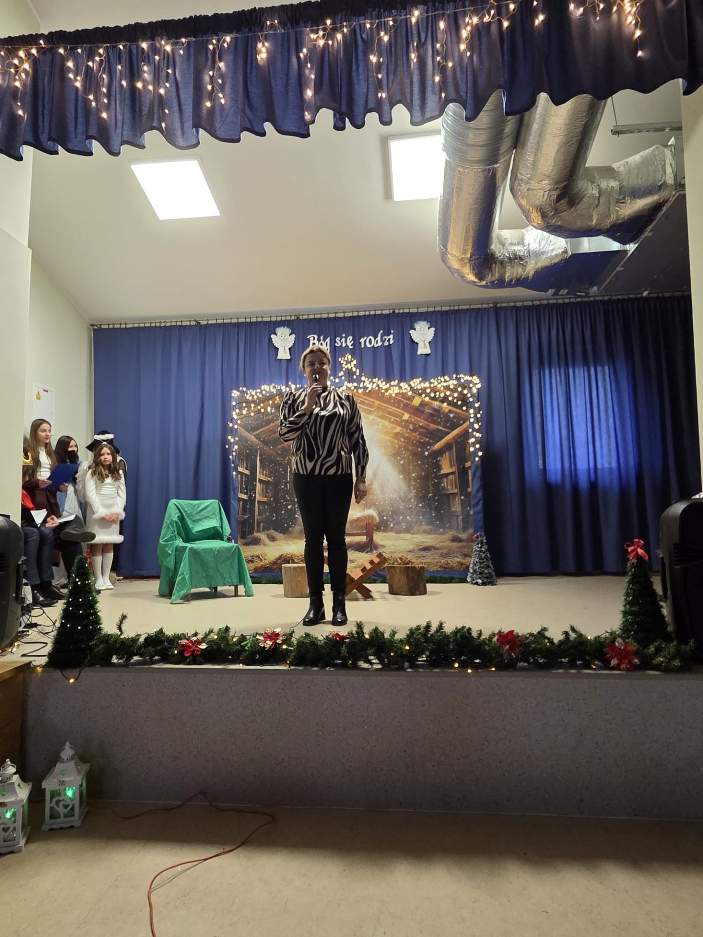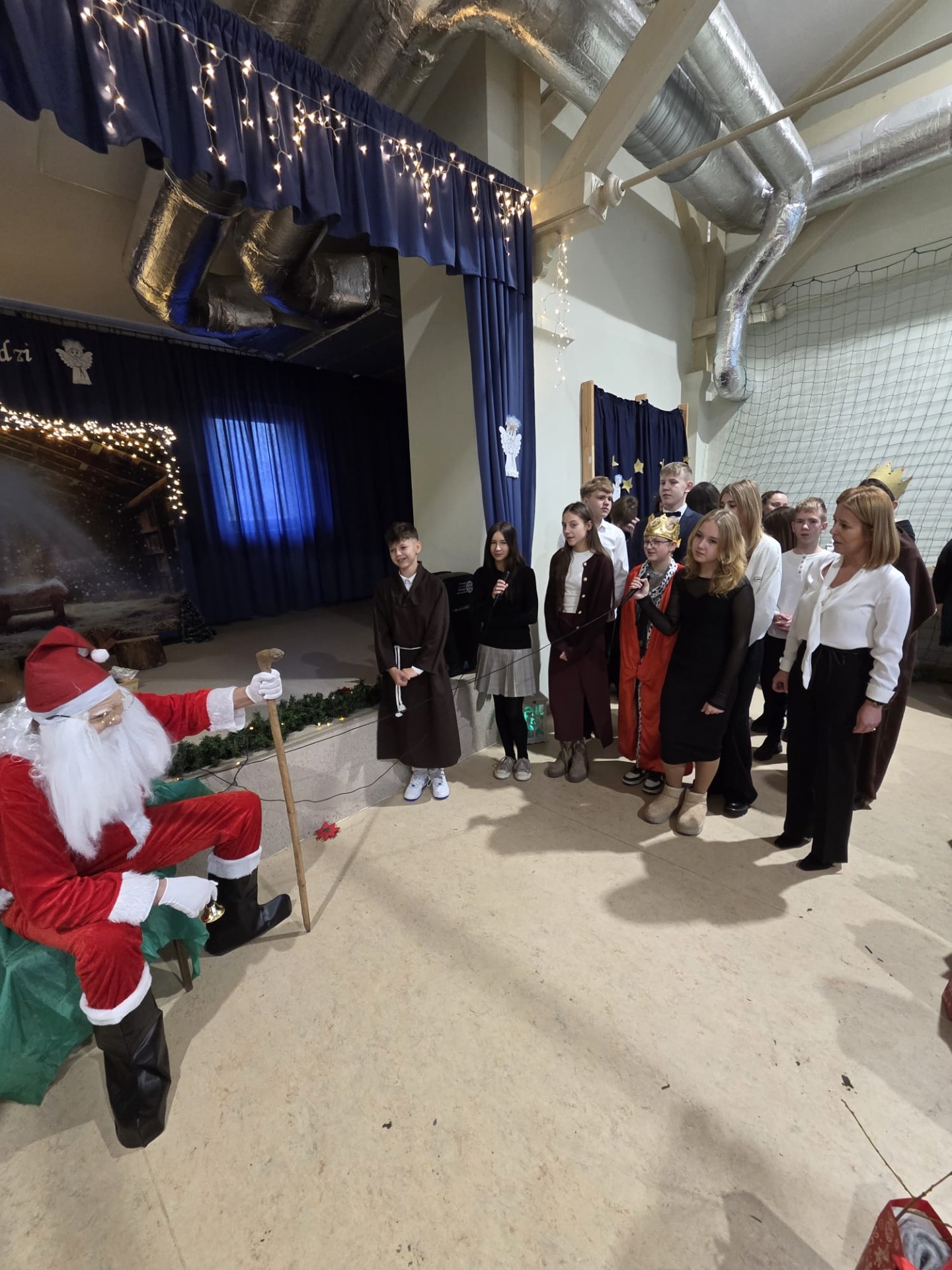 Również przedstawicielka gminy, Pani Justyna Chudek – kierownik referatu oświaty – skierowała do zgromadzonych ciepłe życzenia. Oczywiście nie zabrakło także wizyty Świętego Mikołaja, który wręczył prezenty wszystkim uczniom za pięknie zaśpiewaną kolędę.