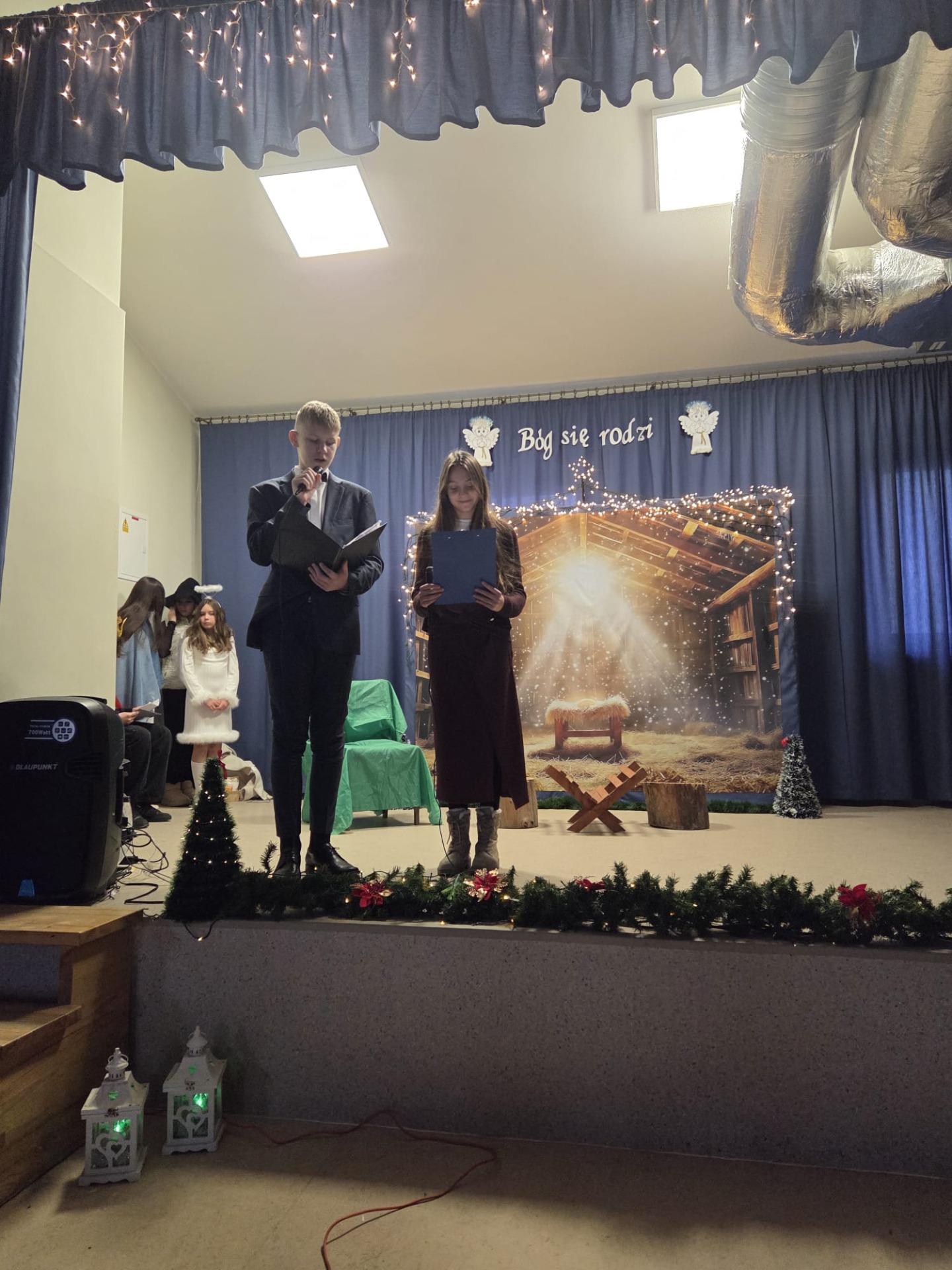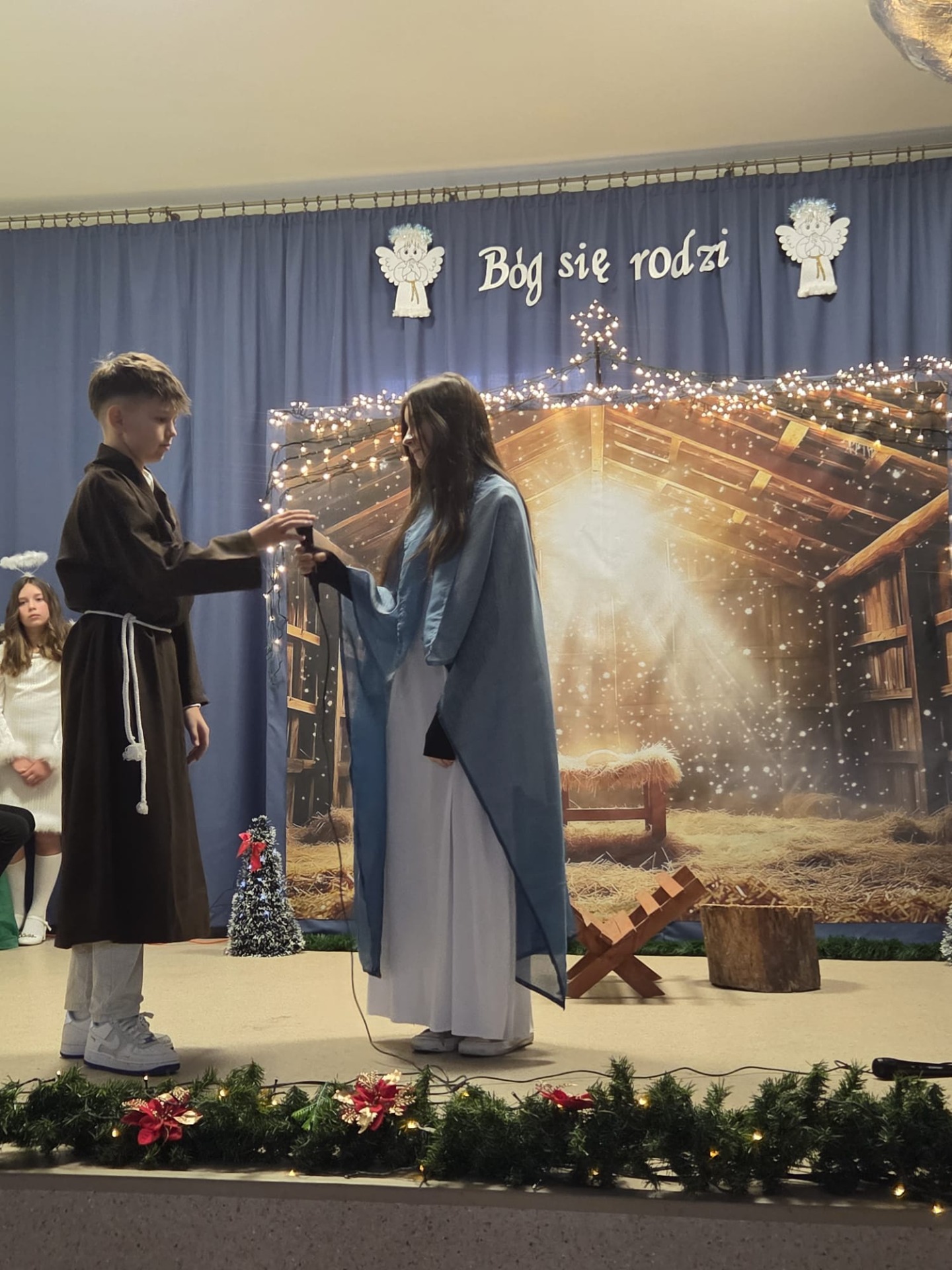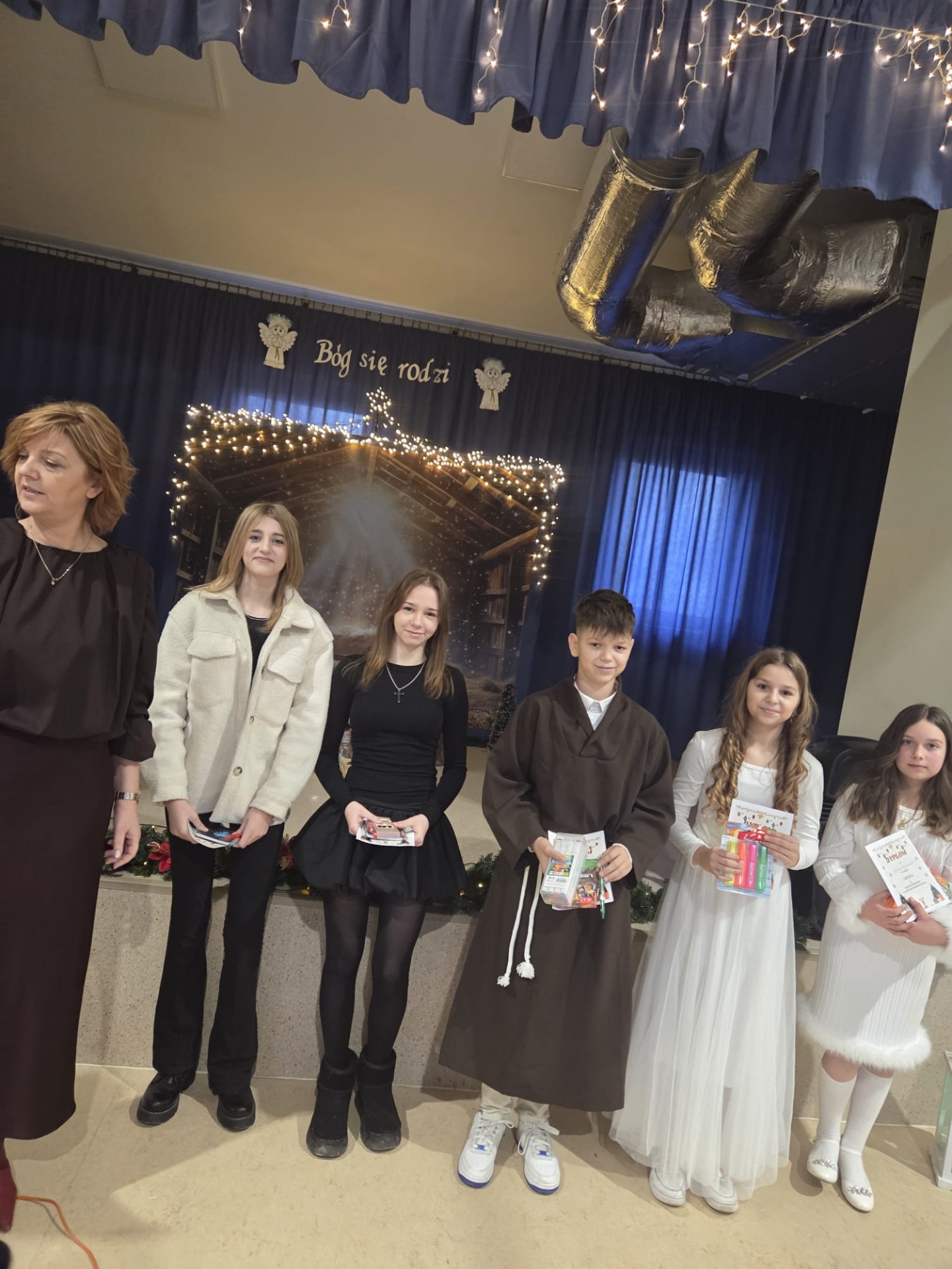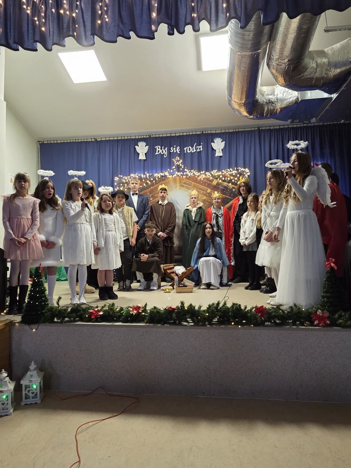 W dniu dzisiejszym odbyły się jasełka w wykonaniu uczniów klas III, IV i VII. Po występie małych aktorów zaprezentowana została projekcja tańca świątecznego w wykonaniu dziewczynek z koła tanecznego. Następnie głos zabrała Pani Dyrektor, która złożyła wszystkim zebranym świąteczne życzenia oraz wręczyła uczniom nagrody zdobyte w konkursach.